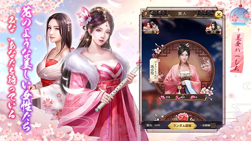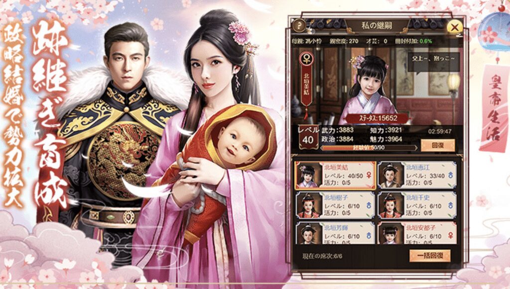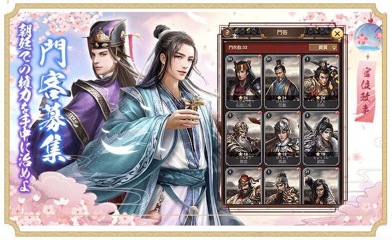 門客と呼ばれるキャラクターを集めて育てたり、能力を強化して権勢(戦力のような数値)を上げていきます。